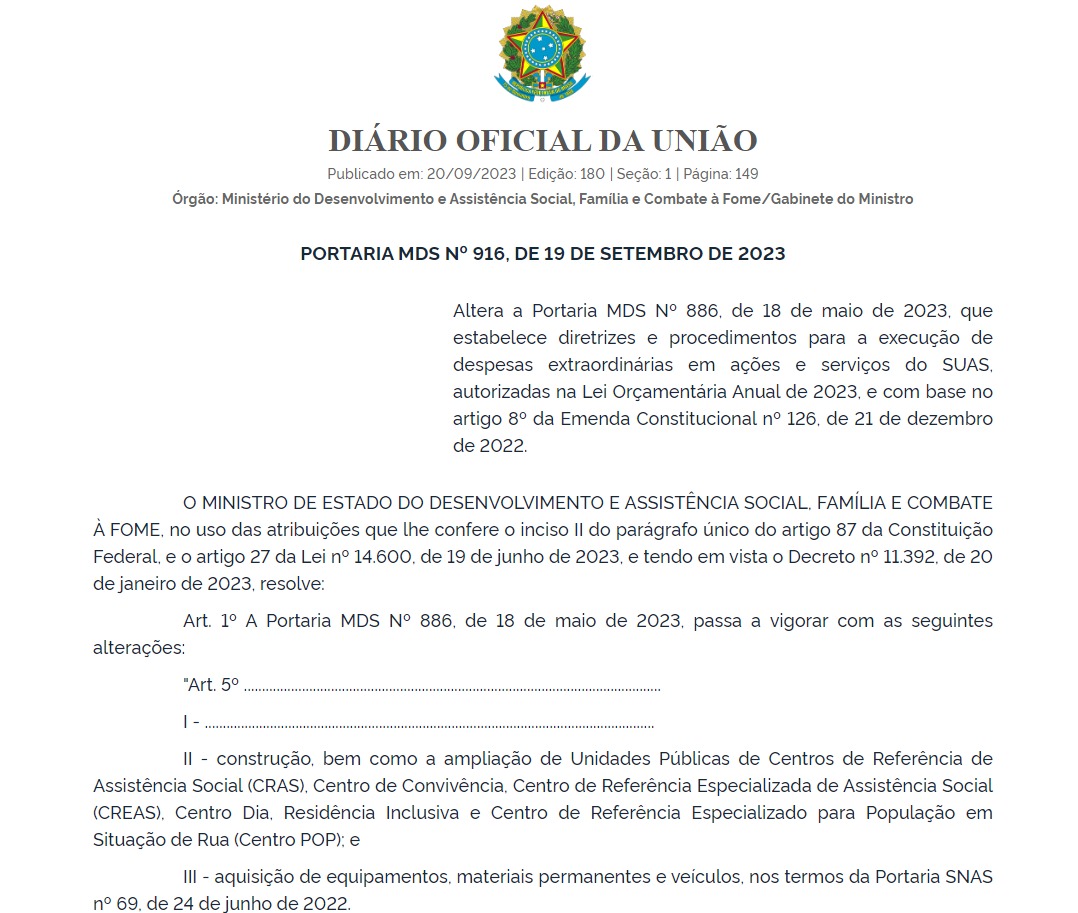 O Diário Oficial da União (DOU) traz publicação da Portaria 916/2023. A medida altera a Portaria 886/2023, que trata dos recursos destinados ao custeio e ao investimento das proteções básica e especial das ações e serviços socioassistenciais.